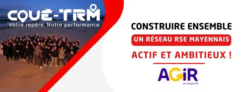 Équipe Coué-TRM réunie sur une plage, illustrant un réseau RSE mayennais actif et ambitieux avec le logo AGiR.